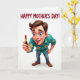This card features a stylized cartoon figure centered on a bright white background, looking straight ahead with wide blue eyes and their tongue slightly out in a teasing, friendly way ❤️. The character wears a teal button-up shirt patterned with small yellow and purple flowers, along with relaxed blue jeans and shiny brown shoes. Their brown hair is neatly shaped, with a soft blush on the cheeks and a sweep of purple eyeshadow that adds a flirty, affectionate tone to the expression. One arm reaches forward as if offering a red lipstick tube with gold and black accents, like a cheeky little gift between close loved ones. The lighting is gentle and even, giving the figure a smooth, slightly three-dimensional look without heavy shadows. Across the top, the message “HAPPY MOTHER’S DAY!” sits in large uppercase letters in bright red, spaced to span the upper area. A few tiny flower shapes echo the shirt’s colors, adding a light touch near the character’s shoulders 🌼.