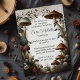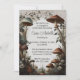 A whimsical mushroom forest illustration in muted shades of beige, green and red.