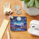 Personalized keychain with a beautiful illustration. Whimsical and fanciful vibe. A big glowing moon with stars all around. Hanging over a lovely landscape of trees, mountains and a winding river. Awesome magical mystical vibe.