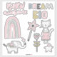Whimsical assortment of Nordic style girly themed sticker illustrations including: star wand, rainbow, word art, flower, elephant and cat. Use for laptops and screens, luggage, mirrors, lockers and more.