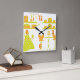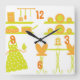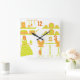 Fun retro inspired kitchen wall clock, with graphics of orange and light green kitchen themed items and darker orange numbers. Customize with your own text or leave as is.