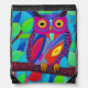 Whimsical Owl with Colorful Feathers Drawstring Bag