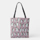 This cute tote bag features a hand drawn black and white penguin pattern on a medium dusty fuchsia background. The penguin images are contrasted with light orange on the feet, head, and chest. They are shown in several positions, with a few scattered snowflakes falling among them. Definitely unique! Both sides of the bag have the same design.