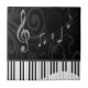 A whimsical musical design with curved piano keyboard keys and musical notes on a subtle flourish pattern in gray on a black background. Ideal for the pianist, piano student or the piano lover.