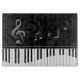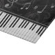 A whimsical musical design with curved piano keyboard keys and musical notes on a subtle flourish pattern in gray on a black background. Ideal for the pianist, piano student or the piano lover.