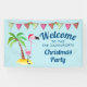 Christmas Party welcome banner. A whimsical drawing of a pink flamingo wearing a red santa hat. Standing on a mound of yellow beach sand with a green and brown coconut palm tree in the back. A festive pink and green bunting banner along the top. Light blue background. Cute and fun festive tropical design