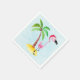 Paper napkins with a whimsical drawing of a pink flamingo wearing a red santa hat. Standing on a mound of yellow beach sand with a green and brown coconut palm tree in the back. Light blue background with a faint polygonal pattern. Cute and fun festive tropical design.