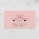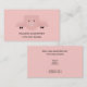 Business cards with a drawing of a cute pink pig's face. Lifted up by his black cloven hooves and peering over a table. Cute and whimsical drawing. Set on a pink background with faded hearts.