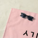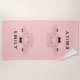 A personalized beach towel with a drawing of a cute pink pig's face. Wearing a black bow tie. Lifted up by his black cloven hooves and peering over at you. Cute and whimsical drawing. Set on a pink background with some faded hearts here and there.