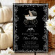 Celebrate the upcoming arrival of your little one with our exquisite baby shower invitation, featuring a stunning gothic-style baby carriage pram elegantly framed by a delicate floral border. The black background adds a touch of charm and sophistication, making it the perfect choice for a memorable event. Invite your loved ones to share in the joy of this special occasion with a design that beautifully balances whimsy and elegance.