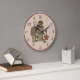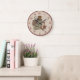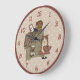 This whimsical, primitive style clock will make the perfect addition to your country and/or primitive style home. With a bow in her hair and her best dress and shoes on looks adorable. She's standing in front of a vintage cabinet which contains a quilt, some boxes and other various primitive items. The entire scene is set against a tan background with white stars and a brown rim around the edges.