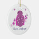 A whimsical ladybug in shades of deep purple. Flirty flowers and swirls accent it. The saying 'I love ladybugs' can be changed as desired.