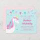 These postcard 5th birthday party invitations feature a cute unicorn design. The unicorn has a colorful mane and flowers on its head. The background is a pastel aqua color with confetti, stars and striped bunting. Personalize these whimsical invitations with your own text.