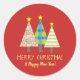 Spread holiday cheer with this playful red round sticker featuring three patterned Christmas trees and the festive greeting: “Merry Christmas & Happy New Year!” A bold red background and colorful tree designs make this sticker perfect for decorating holiday cards, gifts, envelopes, and party favors.