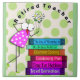 Adorable whimsical bird ceramic tile standing next to a stack of books with titles related to a fun retirement. Background is cream with lime green polka dots.