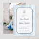 Spanish wedding invitations. This whimsical wedding invitation features a navy blue hand drawn frame against a light blue striped background. At the top of the invite, there is a doodle scribble illustration of a diamond ring in a seashell ring box. The details follow with the couple's names in charming script lettering. Ideal for summer, italian, beach, yacht, and coastal wedding themes. Cards reverse to an engagement photo of your choice. Edit most wording and text colors to make this sweet wedding invite fit your event needs and personal style. View the collection linked on this page for the full wedding suite or visit our store for more wedding invitations. An English-language version of this design is available in our store for bilingual weddings. Invitación de boda con temática costera en español. Invitación editable con rayas azules y diseño elegante inspirado en la playa, perfecta para bodas junto al mar.