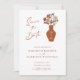 Whimsical Retro Boho Floral Wedding Save the Date... A whimsical floral bouquet in a retro bohemian style sits in a terracotta vase overlaid with your wedding date numbers. The design displays your Save the Date details in modern calligraphy script as well as elegant serif and sans serif typography. The back of the card includes the QR code of your wedding website so guests can follow your journey and also view important info about about your upcoming nuptials. All text, except the calligraphy script, can be easily revised on the personalization template.