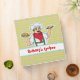 Whimsical retro chef striped recipe binder, featuring a retro, cute chef in whimsical style wearing his cooking uniform whites and hat –toque- and a red scarf and holding two dishes one with a chicken and one with fruit, a striped pattern in green, bue, pink and a scalloped band with text. This fun design is fully customizable and can be personalized.