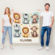 This adorable personalized fleece blanket features a charming collection of sketched animal-themed doodles featuring lions, zebras and monkeys. It is designed with soft, rounded lines and pastel backgrounds in mint green, baby pink, powder blue, and pale yellow.