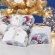 This wrapping paper features a variety of adorable Santa gnomes; there's a little one catching snowflakes with his tongue, one making snow angels, another looking at a bird house, one sledding and another looking at his reflection in a pond that has iced over. There are gold stars twinkling all around them.