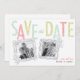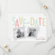 Modern shabby chic save the date with hand drawn letters in fresh shades of bright pink, green and aqua blue. Two decorative frames allow room for your personal engagement photos. Room on the backside for more detailed wedding day information.