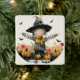 Celebrate Halloween with this charming square ceramic ornament featuring an adorable scarecrow in a witch hat. Perfect for adding a touch of festive fun to your home decor or gifting to a loved one. This unique ornament captures the spirit of autumn with pumpkins, flowers, and playful bats, making it a delightful decoration for Halloween.