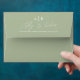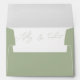 Elegant script calligraphy sage green wedding envelope. Present your wedding invitations in style with these sage green envelopes featuring whimsical script calligraphy. The envelopes showcase a sophisticated sage green color, setting a tone of understated elegance. The envelope flap provides an excellent opportunity for personalization, allowing you to feature your initials and names in graceful script typography, beautifully complemented by your return address in a crisp, white print. The inside of the envelope also features the names of the couple. These are not merely envelopes; they are the first glimpse your guests will have into the beauty and refinement of your wedding day.