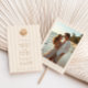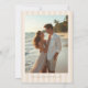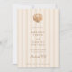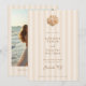 Featuring a beautiful watercolor shell at the top, this unique monogram can be customized with the initials of the bride and groom, adding a touch of intimacy and elegance to your wedding stationery. Whimsical handwritten font elements add a personal and playful touch to your announcement, complementing the minimalist design and inviting your guests with warmth and style. On the reverse side you'll find a photo template and ample space to add your wedding website information. Emphasizing simplicity and elegance, the overall layout is clean and uncluttered, allowing the watercolor shell and your wedding details to shine. This minimalist approach ensures that your invitation is both stylish and timeless. The text is presented in a neutral, mocha brown color, providing a sophisticated contrast against the soft almond colored, striped background. However, you can easily change the font color to match your wedding theme, ensuring a cohesive look throughout your stationery.
