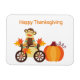 Whimsical bike riding sock monkey with big orange pumpkin and customizable Thanksgiving text on white background
