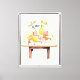 A soft watercolor still life featuring lemons, oranges, a pear, and an apple with delicate flowers, leaves, and berries on a wooden table. Gentle colors evoke a dreamy, whimsical charm.