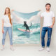 Wrap yourself in coastal fun with this whimsical watercolor blanket featuring a black cat surfing under soft pastel skies. Gentle waves, playful details, and sunny beach tones create a lighthearted, imaginative coastal accent perfect for any space.