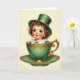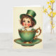 This card features a sweet-faced child with wide brown eyes and tight copper-brown curls, looking straight ahead with an inviting, friendly gaze 💚. The child wears an emerald green top hat with a gold band, and a matching green outfit peeks out beneath a crisp white ruff collar. Nestled inside a green teacup, the figure feels like a tiny companion being carried along for St. Patrick’s Day, with rosy cheeks and cupid’s-bow lips adding warmth. The cup and saucer are a deep green trimmed with curling gold filigree that gives the scene an antique, storybook touch. A soft cream background keeps everything airy and draws attention to the green-and-gold details ☘️. The greeting text sits near the top in green lettering, with a smaller line below it in gold for contrast. Fine gold swirls wrap around the teacup and trail onto the saucer’s rim.