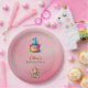 This is a pastel-themed birthday paper plates featuring a dreamy sky background with soft clouds. At the center, there is a colorful cake with a large number "1" candle, symbolizing a first birthday celebration. Cute teddy bear illustrations decorate the corners, adding a playful touch. The text invites guests to celebrate a child's first birthday. Perfect for a whimsical and adorable first birthday party invitation. Customize for a personal touch!