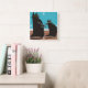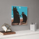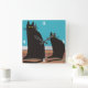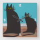 Whimsical Black Cats Art Clock, Two adorable black cats "Where's Our Dinner?", waiting patiently in the kitchen. Artist hand drawn cat art on a teal blue and brown background.