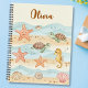 This personalized notebook features adorable baby sea creatures—starfish, turtles, and seahorses—set against gentle wave patterns and a soft sandy background. This playful design has soothing pastel blues, warm sandy tones, and coral accents.