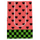 Whimsical gift bag features watermelon pink and black hearts pattern with dark green checkerboard bottom border.