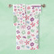 A modern whimsical floral patterned bath towel set. This delightful ensemble features a lively combination of blue, green, pink, and purple hued flowers, creating a refreshing and inviting atmosphere that instantly brightens up your space. Insert a monogram on the washcloth and hand towel.