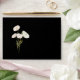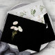 A chic black envelope is decorated with pretty white wildflowers. There is a free flowing bouquet on the front, a smaller arrangement on the back flap and the inside is lined with a wildflower pattern. This item is part of the Whimsical Wildflower Collection that you can use to create a unique wedding stationery suite.