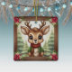 Whimsical Xmas Reindeer Holiday Decoration, rustic square ceramic ornament featuring a brown wooden frame, with Christmas poinsettia flowers and a cute baby forest animal, unique deer with antlers in a cartoon graphic art style wearing a jacket and scarf, standing in the foreground. Wintry trees, complete the winter season charm of this woodland wildlife doe character illustration, making for a great gift. Fawn lover design is on front and back. So no matter how the hanging decor turns, it always looks festive and complete. Get yours today!
