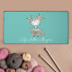Whimsical desk mat features girl with hair buns secured with knitting needles winding a ball of yarn. Customizable "Life is better with yarn" white text on turquoise background
