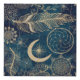 Trendy, magical gold dreamcatcher mandala floral pattern, featuring a collection of tribal feathers, mandala flowers, geometric flowers, the moon, the sun and the stars, circles, dots, squares, triangles, chevron zigzag, geometric shapes, a mandala with a protection eye, made with yellow gold and silver dots shining glitter sparkles mystical image, over a midnight blue, dark blue gradient starry glow background. This trendy, mystic, tribal, fashionable, fantasy illustration, bohemian girly design, is perfect for everyday wear, home decor, celebrations and special days theme decorations.