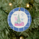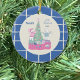 An adorable first Christmas ornament featuring a whimsical retro illustration of two polar bear cubs decorating a tree for the Holidays on the front and a blue and cream grid pattern on the back . Personalize it with the child's name and the year . You can also add a baby photo on the reverse side by using the editor tool .
