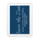 Whimsy Save the Date Magnet in blue and white with a simple and fun script typography design. This trendy save the date magnet is easy to customize with your wedding details. For more customization options, click on the Customize It button.