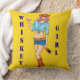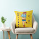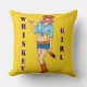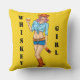 Throw pillow featuring a pop art pin up illustration of a rodeo girl in cowboy hat and glass of whiskey in hand against a yellow background with white dots.
