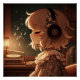 In a cozy, dimly lit room, an anime girl with headphones sits by a record player, lost in the music. The night sky, dotted with stars, peeks through the window, adding a touch of mystery to the serene atmosphere. Musical notes float around her, creating an enchanting and introspective scene.