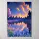 Concealed behind a cloudy sky, a charming dusk unfolds, revealing a serene lake surrounded by a beautiful forest and a meadow adorned with a vivid tapestry of colorful flowers. Nature's secrets come alive as twilight whispers its enchanting melodies across the landscape.