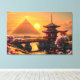 A captivating fantasy artwork depicting a tranquil sunset over a serene river, where a traditional Japanese bridge gracefully curves, framed by vibrant cherry blossoms and lotus flowers. A majestic temple and red torii gate stand proudly, while a massive pyramid looms in the background, blending ancient cultures into a harmonious scene. The warm glow of the setting sun casts golden shadows over the scene, creating an atmosphere of serenity and tranquility. Perfect for lovers of cultural fusion and serene beauty, this piece is ideal for home decor or as a special gift.