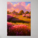 This digital artwork showcases a vast field covered in lush green grass and delicate pink flowers. In the distance, a few trees can be seen silhouetted against a sky filled with warm tones from the setting sun. Rays of sunlight shine through the clouds, creating a peaceful and serene atmosphere. The perfect addition to any space in need of a touch of natural beauty and tranquility.