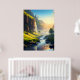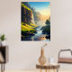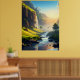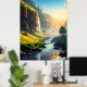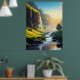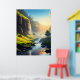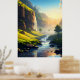 A stunning view of a serene valley where crystal-clear waters flow gently through lush green meadows, with towering cliffs and cascading waterfalls bathed in golden sunlight. This breathtaking landscape captures the harmony of nature’s beauty and tranquility, making it perfect for wall art or décor.