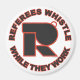 Referees really do whistle while they work. Referee's letter R logo with whistle shape. Customize with a name and/or number or a different colored background, if you like, by clicking on "Customize this design".